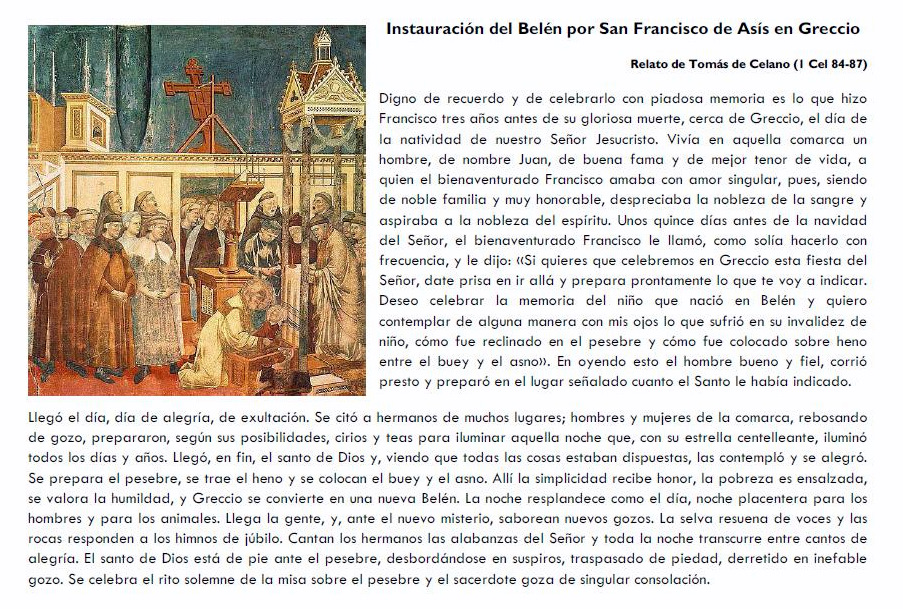 ¡BUENAS TARDES Y FELIZ JORNADA! ¡GRAN APORTACIÓN DEL BUENO DE SAN FRANCISCO! San Ignacio de Loyola propone imaginar las escenas evangélicas, y San Francisco consiguió revivirlas. De esta manera, desde entonces, numerosos artistas belenistas nos deleitan con sus creaciones, e incluso iniciativas solidarias e integradoras tienen lugar. Dentro de poco, en Torrelavega, El SOAM (SERVICIO DE ORIENTACIÓN AL MENOR) dinamizada por el Terciario capuchino FeliX van a representar cinco escenas del Belén con trajes elaborados por ellos mismos. Éste también es un regalo de Navidad. Un fuerte abrazo: