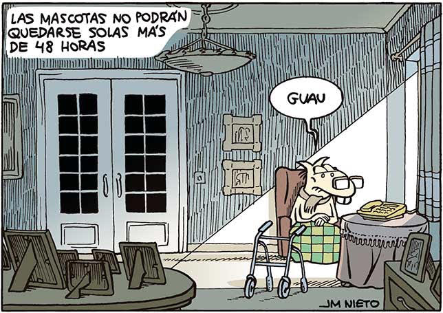 Me vino a la mente una viñeta que publicó hace unos años el gran José María Nieto en relación con la ley que aprobó la Comunidad Autónoma de La Rioja, que prohibía que las mascotas estuvieran solas más de 48 horas y obligaba a sus dueños, entre otras cosas, a pasearlas dos veces al día.