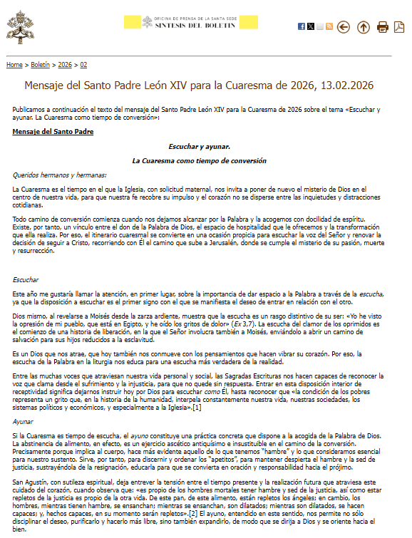 Os adjunto también el mensaje del Papa León XIV para la Cuaresma 2026. «Escuchar y ayunar. La Cuaresma como tiempo de conversión»