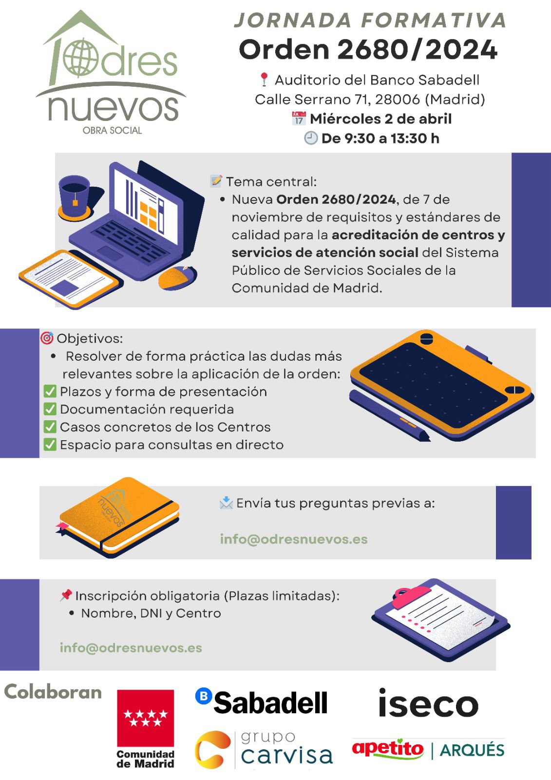 Desde Odres Nuevos , en colaboración con la Dirección General de Evaluación, Calidad e Innovación , os invitamos a una Jornada Formativa sobre la nueva Orden 2680/2024 (acreditación de centros y servicios del Sistema Público de Servicios Sociales en el ámbito de la dependencia).