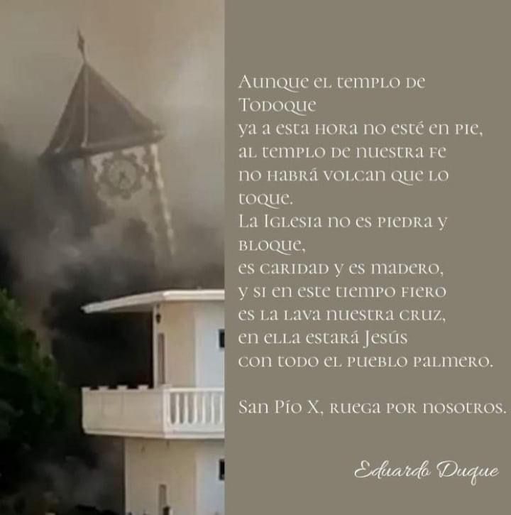 «Aunque el templo de Todoque ya a esta hora no esté en pie, al templo de nuestra fe no habrá volcán que lo toque.la Iglesia no es piedra y bloque, es caridad y es madero, y si en este tiempo fiero es la lava nuestra cruz, en ella estará Jesús con todo el pueblo palmero«. (Eduardo Duque)
