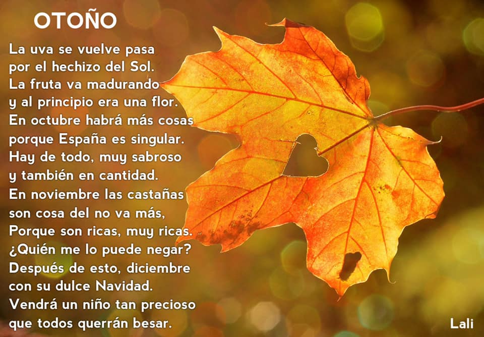 Como todos los meses (tengo pendiente una de los meses de vacaciones que no os pude enviar), os adjunto la Poesía que nos regala Lali, residente de la Residencia Santa Teresa y San José, para esta época de Otoño que estamos viviendo.