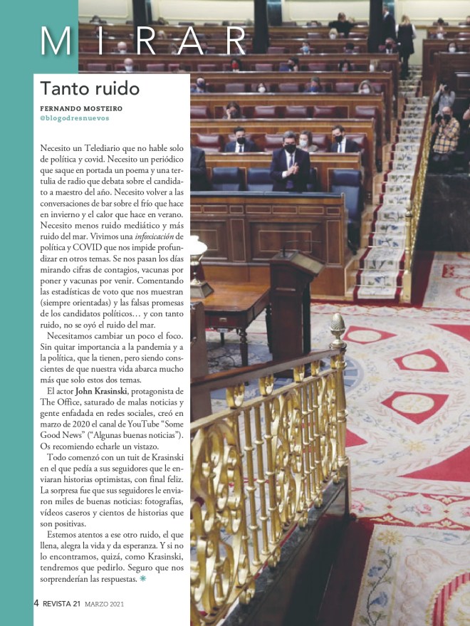 Como todos los meses os comparto mi comentario en la sección “Mirar“, de Revista21. El comentario de este mes de marzo de 2021 en relación a los dos temas que tienen colapsado nuestro día a día: la política y la COVID.
