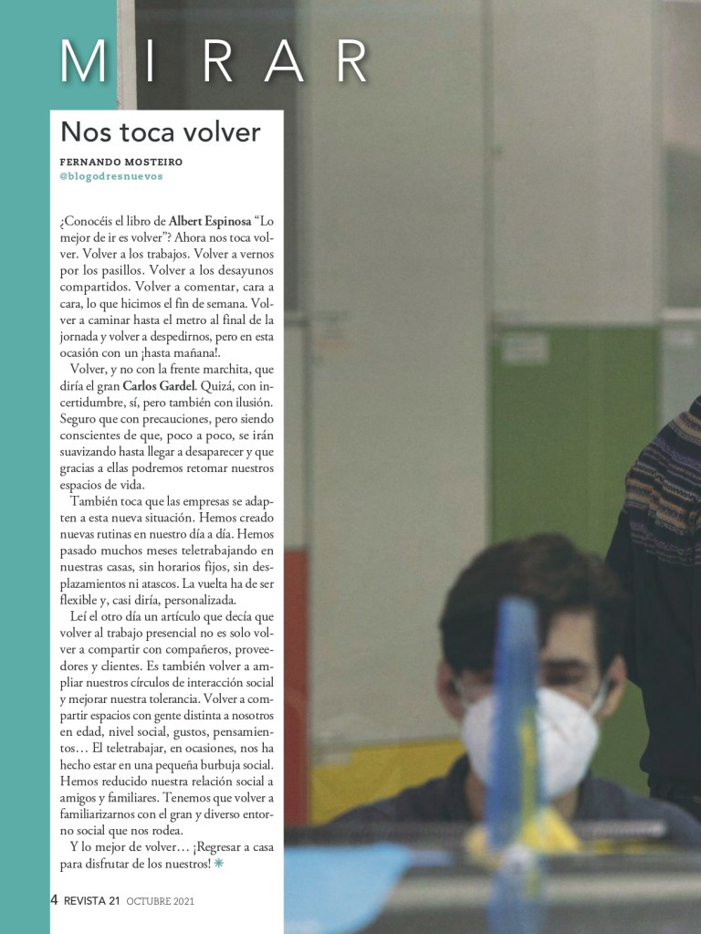 Como todos los meses os comparto mi comentario en la sección “Mirar“. El comentario de este mes de Octubre de 2021 sobre la vuelta a los puestos de trabajo.