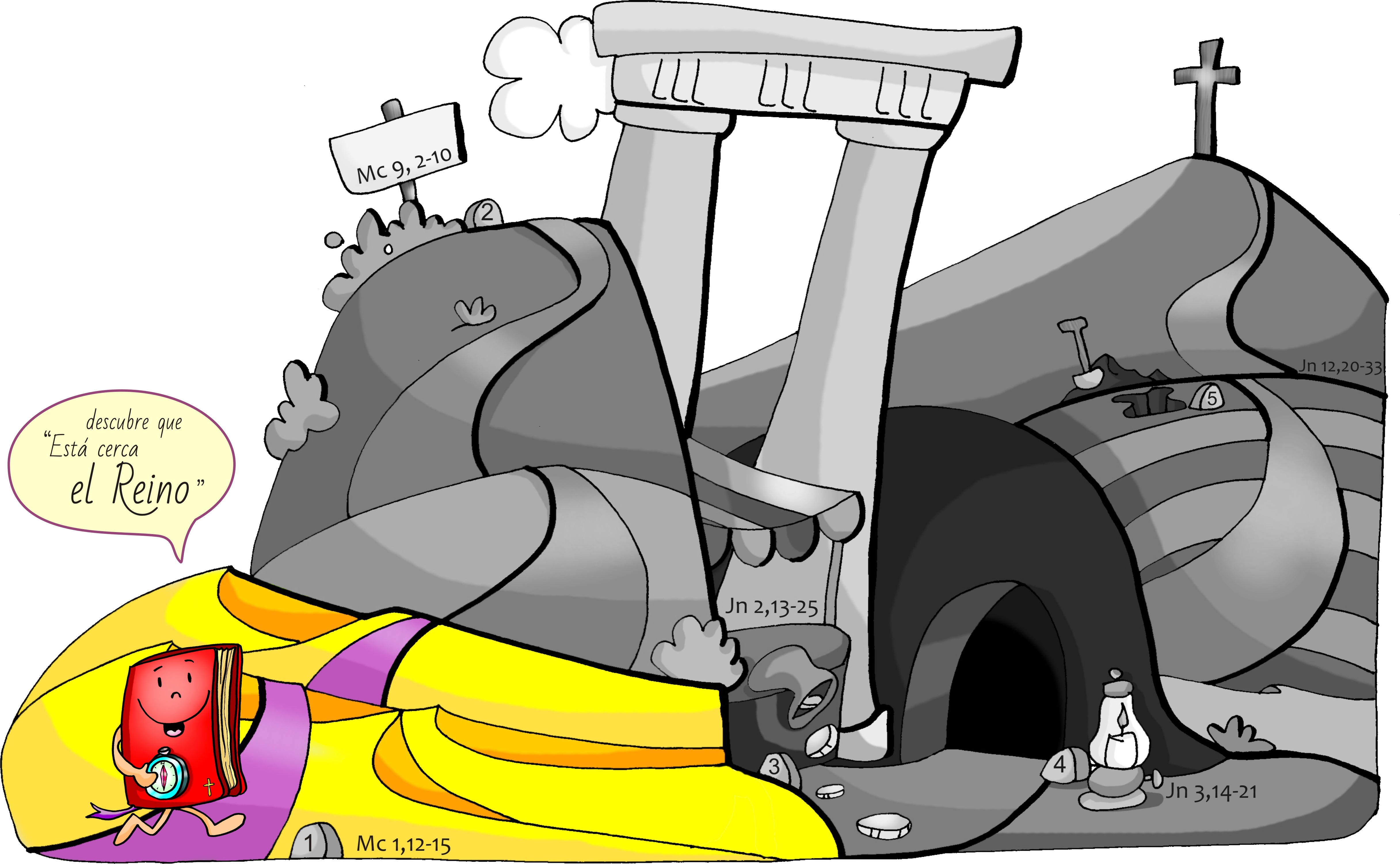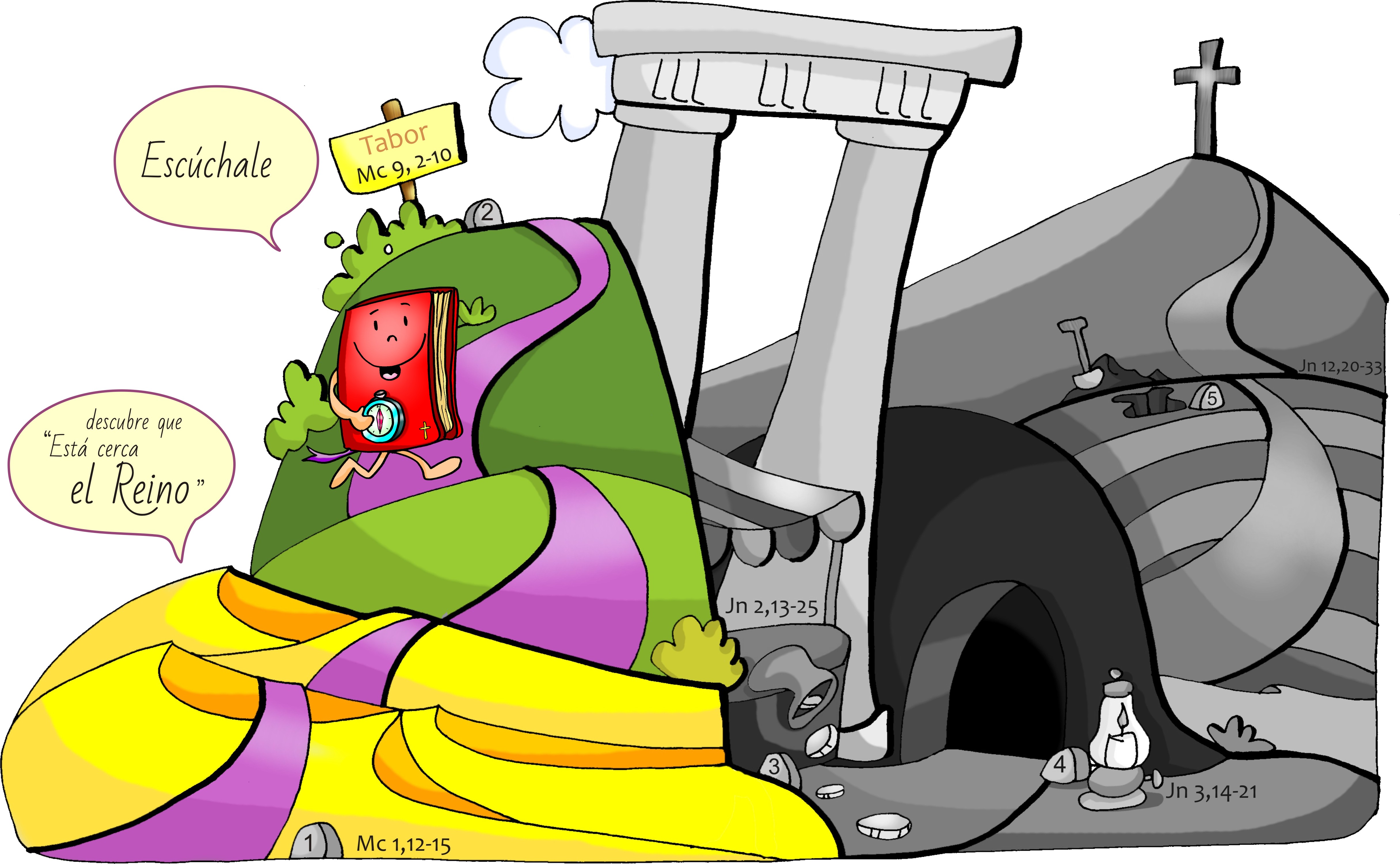 -Nosotros en la eucaristía imprimiremos el archivo MUPPY (tamaño 1,79 x 120 que como es el tamaño de las marquesinas de los autobuses sale muy barato) recortaremos el evangelio y las frases de los bocadillos y haremos que el evangelio avance por las distintas ubicaciones y añadiremos cada domingo una frase. También lo mandamos en A4