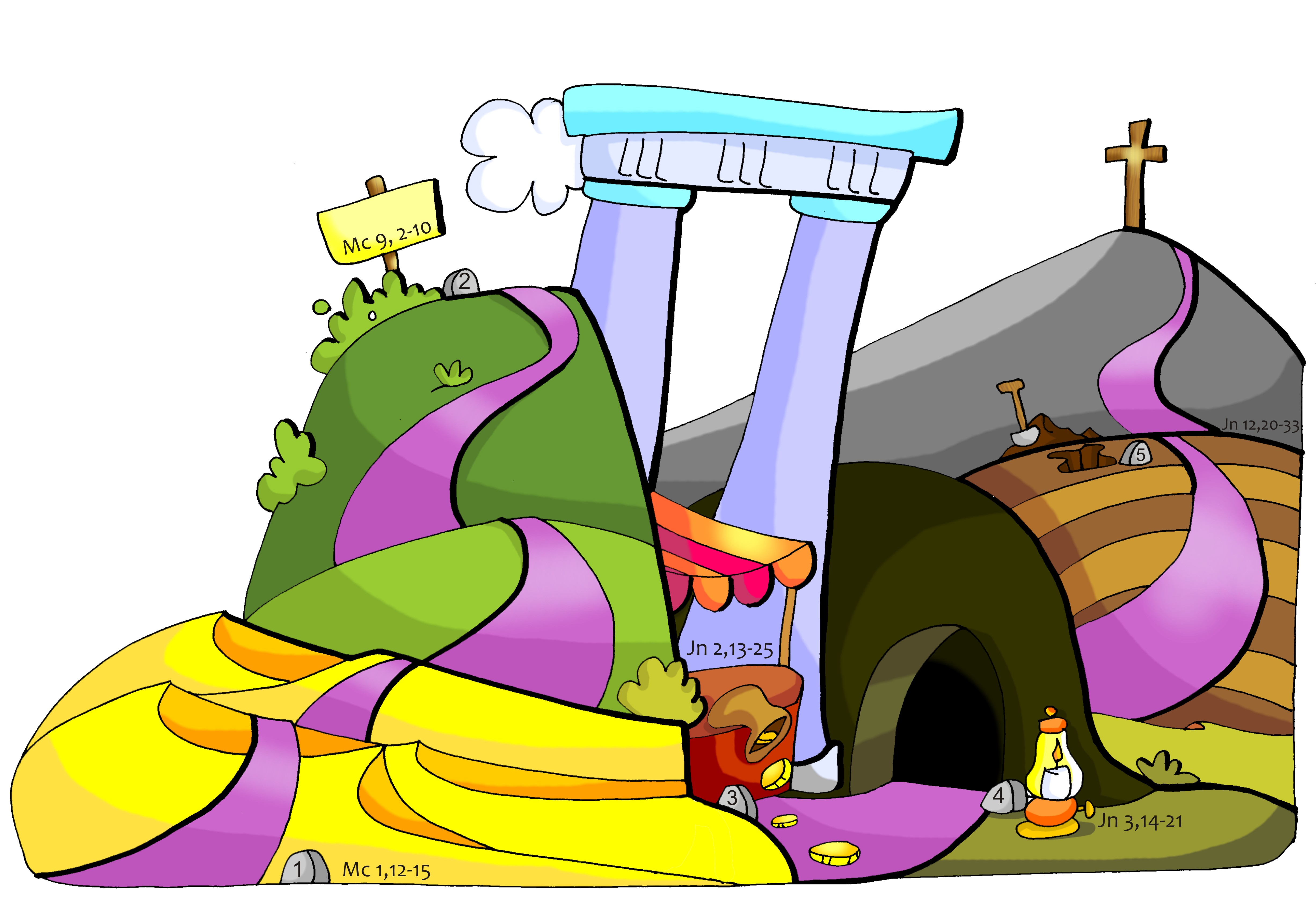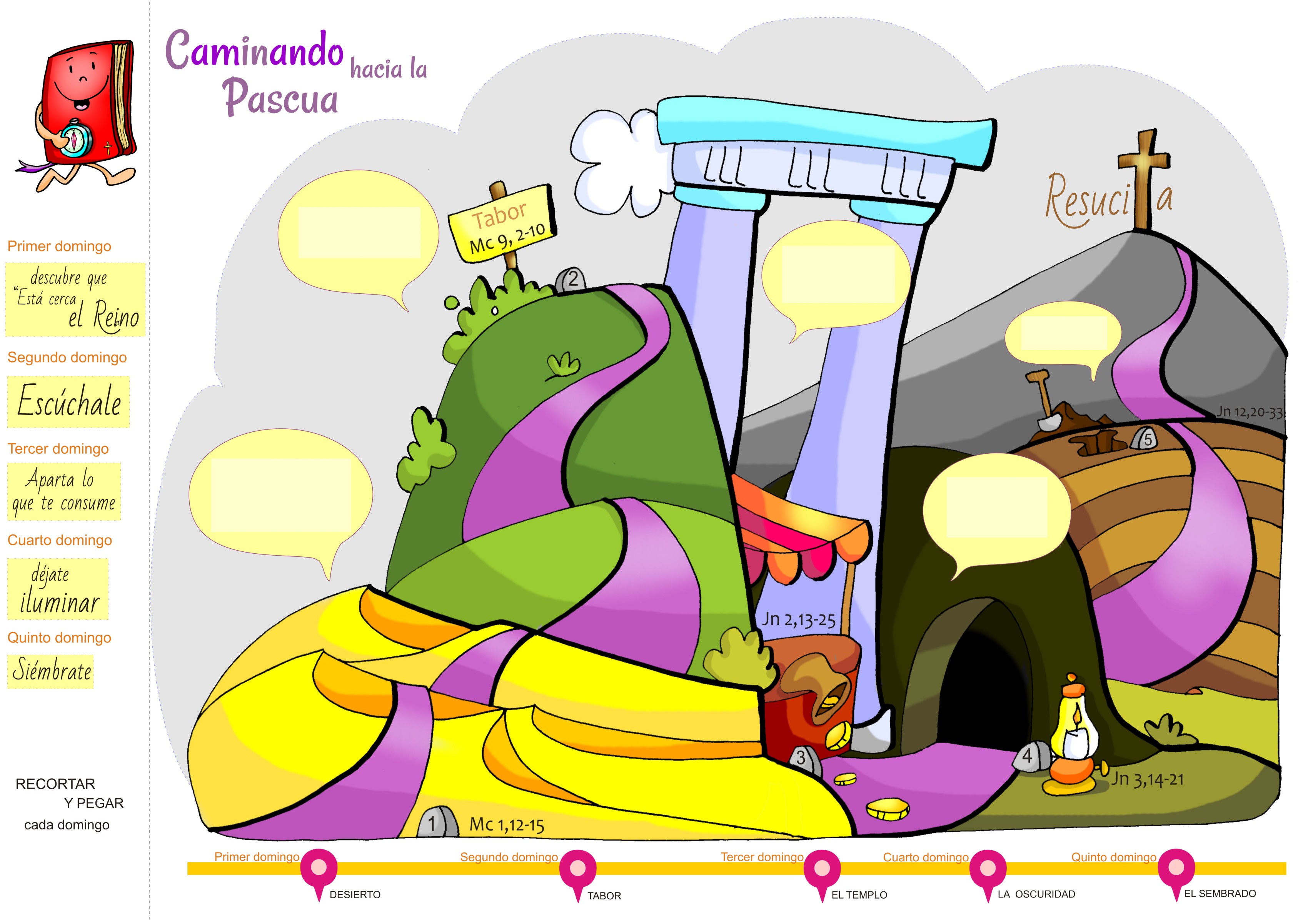 Es Hacer un camino ( pintado de morado) que nos irá ubicando en distintos espacios cada domingo: