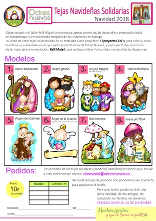 Como sabéis la venta de estas tejas irá destinada en su totalidad a dos proyectos: El Proyecto COV´s, que gestiona Fundação Encontro en Mozambique, para niños y niñas huérfanos y vulnerables, en el que participa la Obra Social Odres Nuevos, y el Proyecto de promoción de la mujer gitana en exclusión, Kelli Majarí, que se desarrolla en la barriada marginal de los Asperones (Málaga).