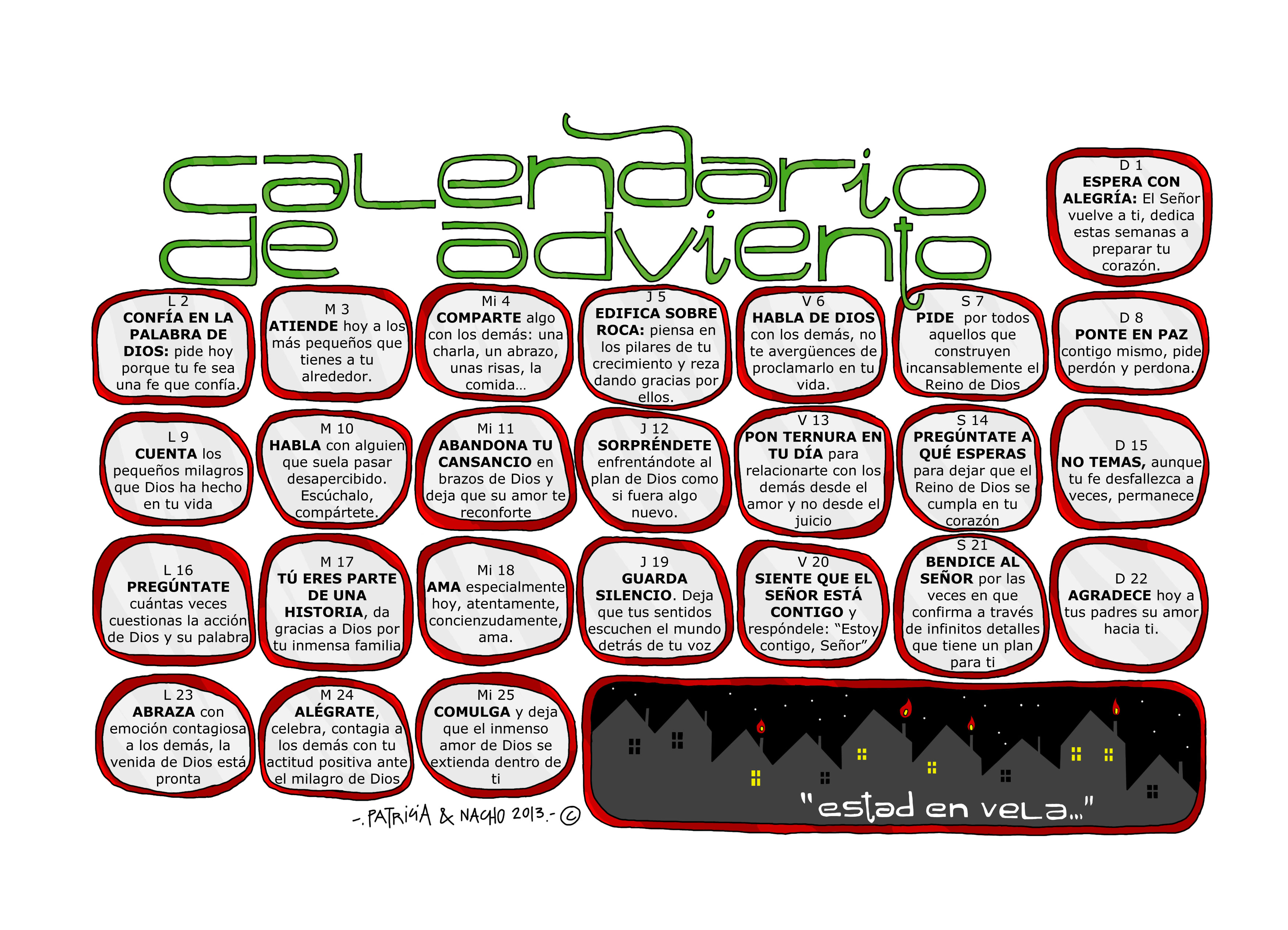 Este calendario de Patri, con sus pautas, con su preparación, con sus momentos y tiempos, es el mejor de los antídotos ante ese «adelanto comercial de la Navidad» que os comentaba en la entrada del otro día. Es la mejor de las explicaciones, si lo ponemos en práctica, para nuestros niños y jóvenes (para nuestras catequesis y para nuestras propias casas). Es esa «contracampaña», que ya comentábamos el año pasado, contra esa publicidad navideña que sólo se centra en lo comercial. Es, en definitiva, nuestro momento de Adviento.