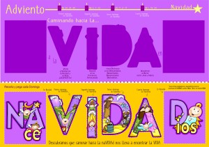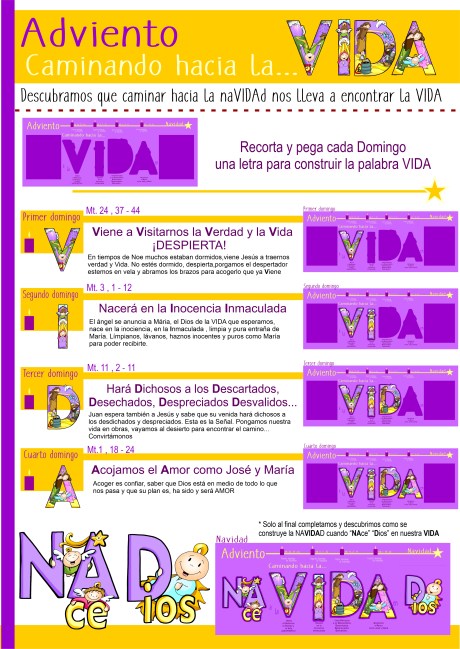 «Familia aquí os mando lo que hemos preparado para Adviento. Cuatro domingos para escribir letra a letra la palabra VIDA. y al final (no desvelarlo antes) añadiendo «NAce»» Dios» descubrimos que navidad contiene la palabra VIDA porque el Adviento es caminar hacia Jesús que es la VIDA naVIDAd. Conclusión Nace a la VIDA en Dios…